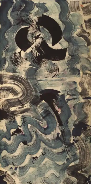 In other paintings of the same series emerge some notes extracted from the traditional Chinese calligraphic and pictorial solfege. They are a kind of confrontation with the reminiscence of his youth works, when he painted picturesque views of Beijing’s traditional alleys to sell to foreign tourists. The incessant repetition of these elements, repeated in aniconic and monochromatic fragments, accentuates the sterility of gestural mechanicism. They are used by the painter to express his disenchantment with the artificiality of the skillful combination of these elements to achieve the mimicry of visible reality. Such signs can take the form of completely stylized bamboo leaves or traces employed in the composition of Chinese characters, rehearsed tens of thousands of times by the artist in the past. All these revivals are subjugated by large black brushstrokes, which in some cases cover and hide everything. The same ones that extinguish the joviality of the pink and turquoise color fields, tones that characterize some series developed by the artist previously.